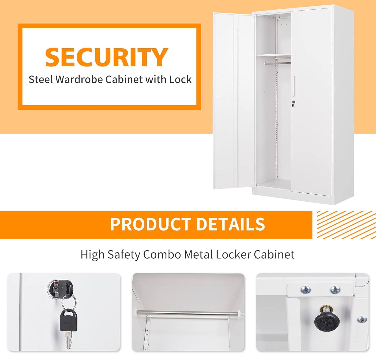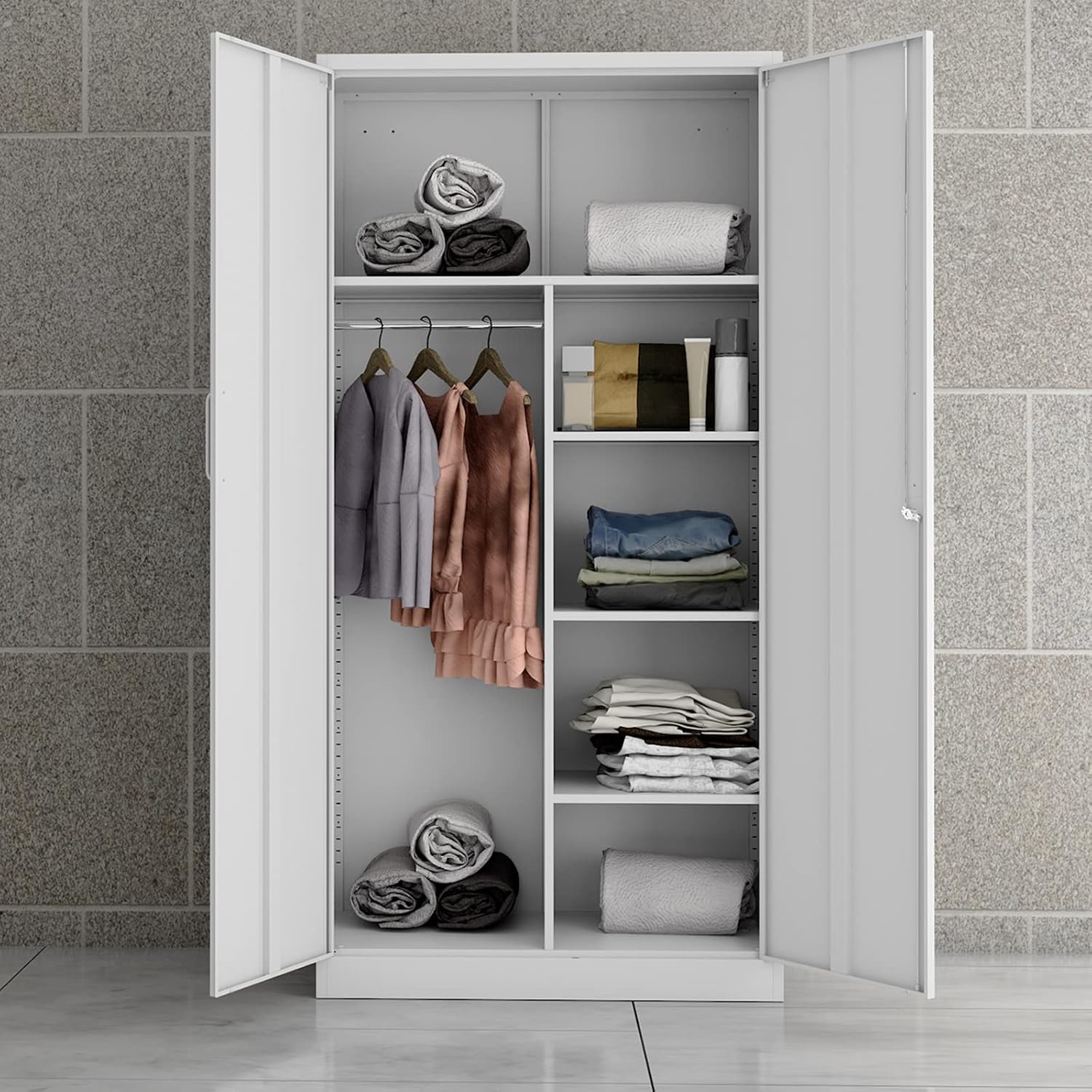• 【Steel Wardrobe Cabinet】:Equipped With 4 shelves and one hanger rod, this steel cabinet (71" x 31.5" x 17.7") provide ample storage space. It can be used as a garage cabinet, wardrobe, filing cabinet or storage your sports equipment or cleaning supplies.