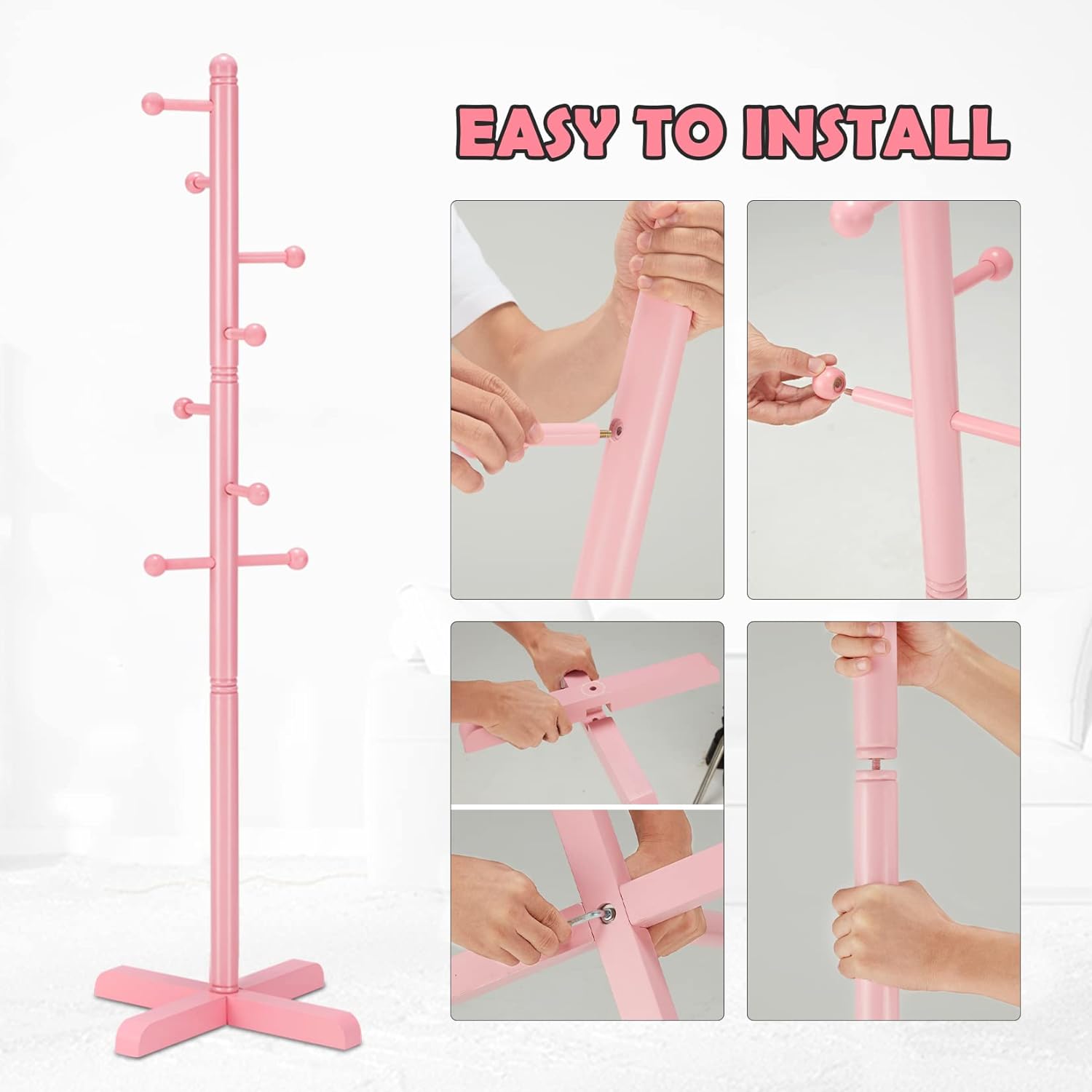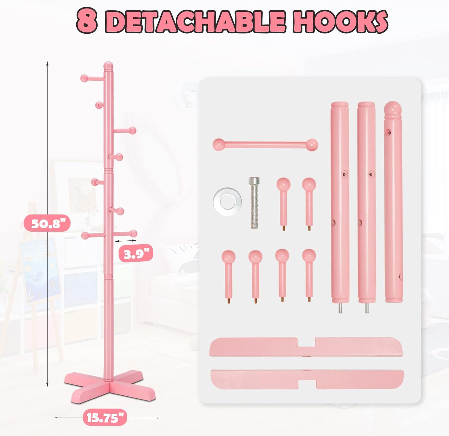 Kids Coat Rack, Freestanding Coat Racks with 8 Hooks 2 Adjustable Height, Tree Coat Rack for Bedroom, Hallway, Entrance, Office, Hats, Handbags,Purse (Pink)