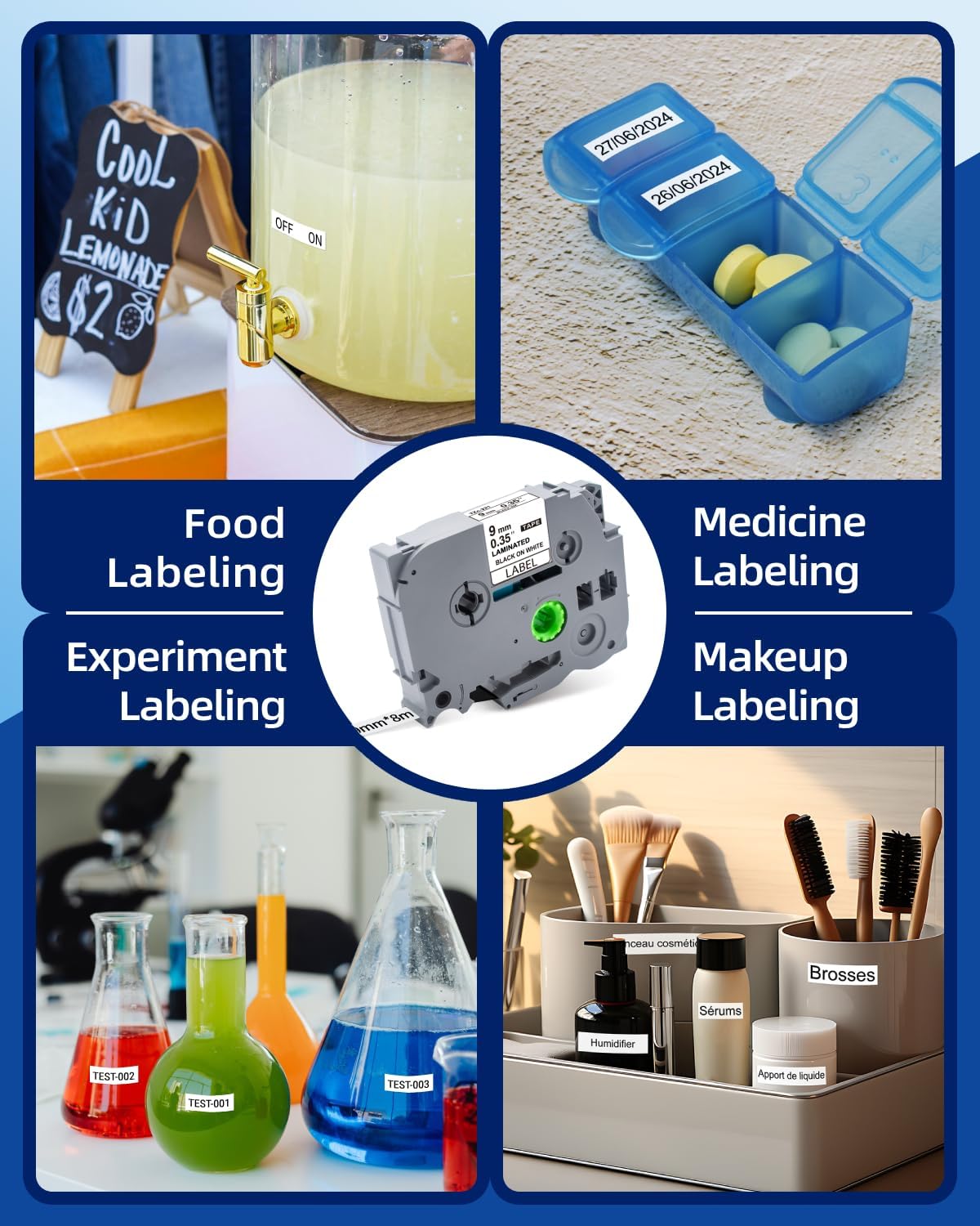 • Compatible for Brother Tz tape 9mm 0.35 laminated white : For indoor & outdoor label maker tape 9mm 3/8 is self-adhesive. Commonly used in homes, offices, schools, restaurants, factories, warehouses, shops, banks, hospitals, governments, hotels, laboratories, farms, repair shops and other scenes to distinguish items, mark dates and prices, operation prompts, mark personal items, etc.