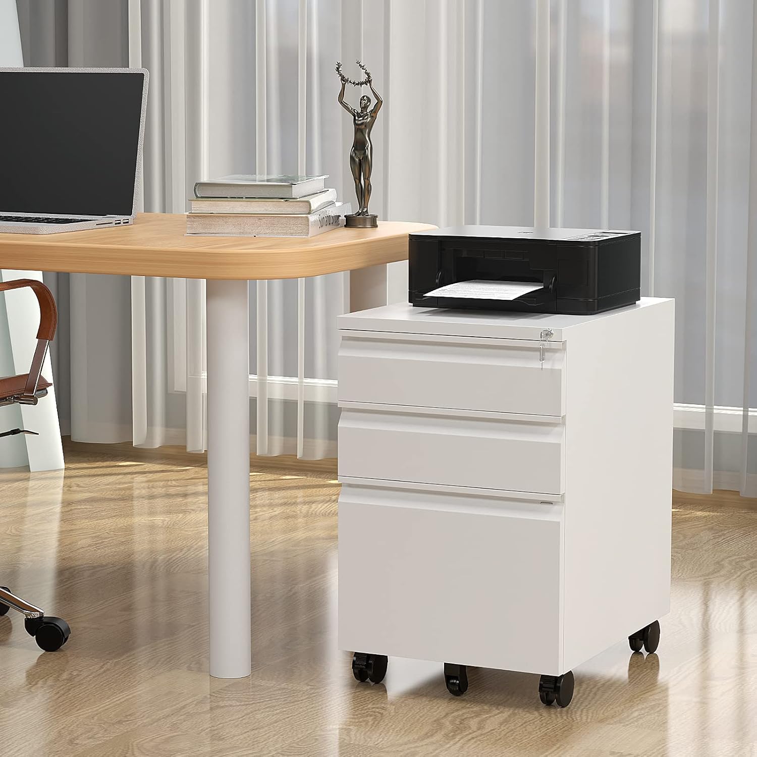 3 Drawers File Cabinet with Lock Metal Vertical File Cabient with Wheels Mobile File Cabinet for Office Home Fully Assembled (White)