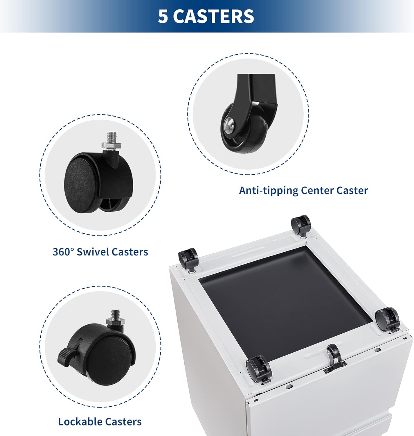 • Various wheel combinations: A total of five wheel combinations of 2+2+1 are used at the bottom of the movable cabinet. The design of 2 brake wheels can fix the file cabinet, and 1 anti-tipping wheel can protect the cabinet from tipping forward.