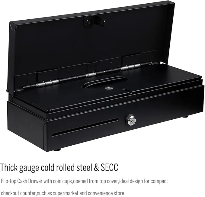 • Flip-top Cash Drawer is made of thick gauge cold rolled steel and SECC, with coin cups, opened from top cover,ideal design for compact checkout counter,such as supermarket and convenient store.
