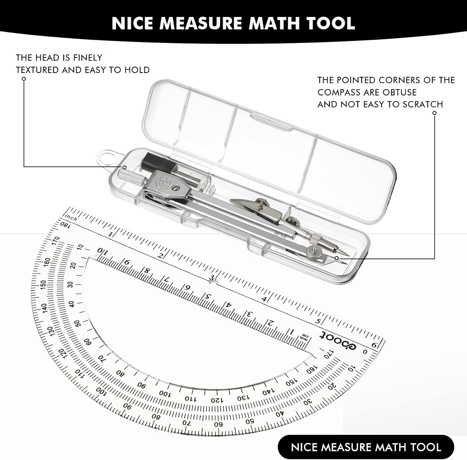 • Strong Material: the math compass for geometry adopts nice technology, the gears of each component are tightly meshed and not easy to loosen, the metal pointed corners of the compass are obtuse and not easy to scratch, and the head of the compass is finely textured, which is easy to hold; The digit protractor is made of ABS plastic material, which has nice toughness and is not easy to break
