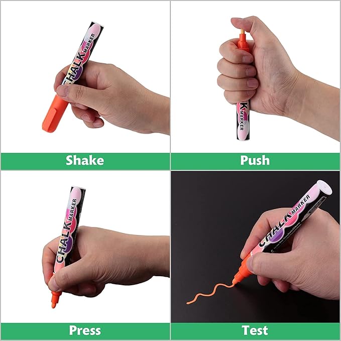 • Prep work before use - Liquid chalk is already a very mature product. Follow the normal steps first you need to shake the body of the pen to let the pigments mix well. Then you need to press the tip of the pen to let the paint flow smoothly. Finally, remove the excess pigment and you can use it normally as a pencil.