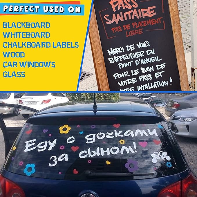 • Wide application - Dates on restaurant menu boards, car windows, children's art, calendar, bistro boards, whiteboards, window and mirror markers, LED writing boards, school and office projects, light panels, glassware, plastic products, metal products, kids' glossy chalkboard, food containers, ceramic mugs, chalkboard contact paper, chalkboard labels, thank you stickers, wall decals, etc. You are free to use your creativity.