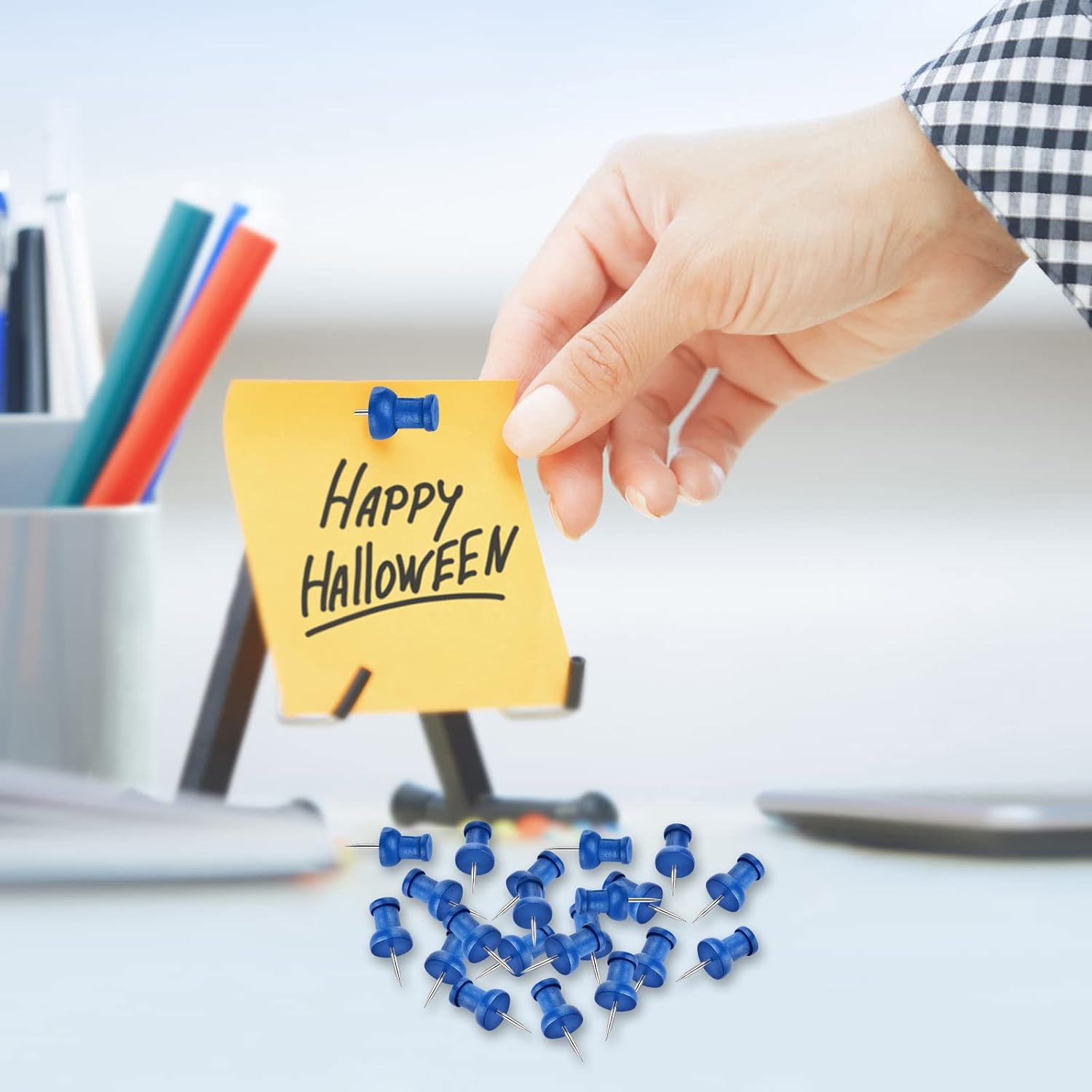 • Blue wooden push pins, which is environmentally friendly and adorable, could also be serve as a family decoration.
