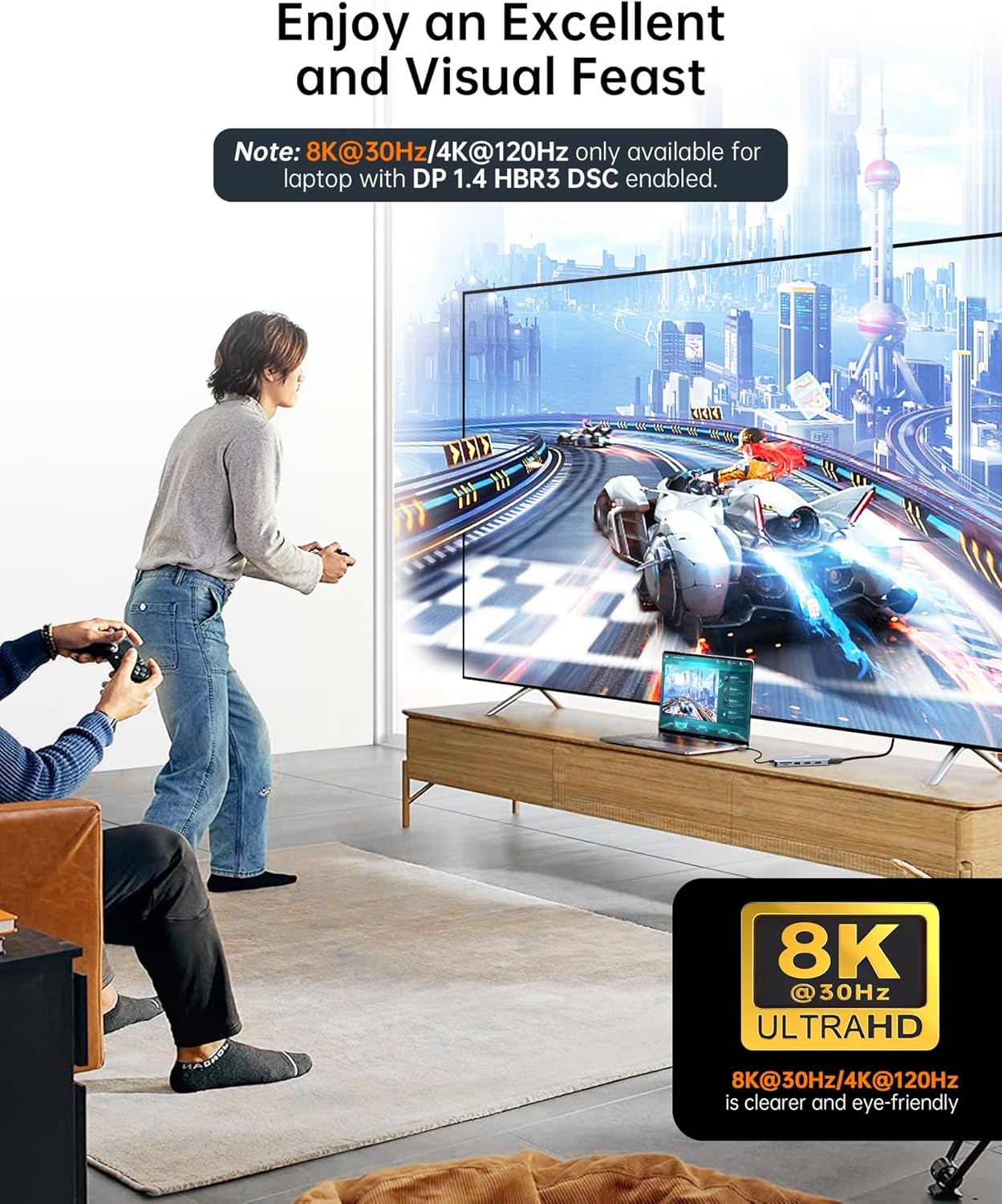 • 【Triple Display USB C Hub Dock】This docking station to dual HDMI+DP ports can mirror or expand videos to external three or dual monitors. Support both SST mode For OS System and MST mode For Windows System.Stream movies, presentations or video games on your monitors in one click: 2 HDMI ports can be used simultaneously, resolution up to 4K@30Hz. Please note that if you use it to connect MacBooks, it only support mirror mode.