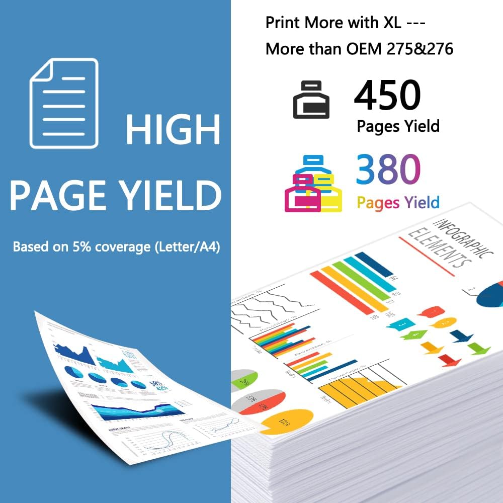 • High Page Yield: Print More with XL --- Up to 450 pages per PG275XL Black, 380 pages per CL276XL color cartridges (Cyan, Magenta, Yellow) (5% coverage)