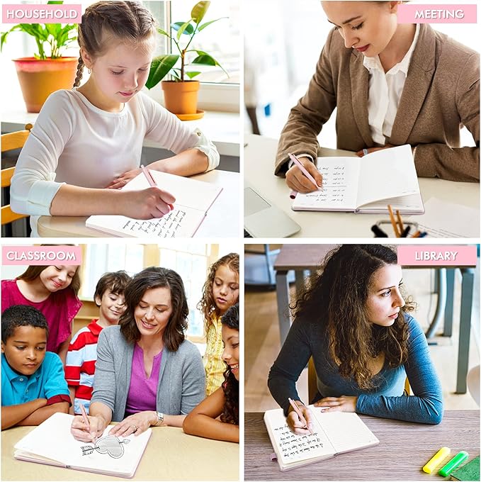 • Feela 12 Pack Classic Ruled Notebooks contains 12 rose pink ruled sturdy cover notebooks and 12 Black Retractable Pens. Each of the notebooks measures 8.3” x 5.1”, which is perfect to carry and easily held by young girls and boys. These black cute pens are customized to be placed in the pen holder, which is pretty convenient.