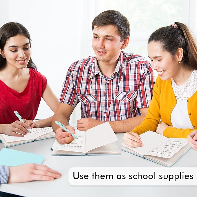 • Feela 12 Pack Classic Ruled Notebooks contains 12 sky blue ruled sturdy cover notebooks and 12 Black Retractable Pens. Each of the notebooks measures 8.3” x 5.1”, which is perfect to carry and easily held by young girls and boys. These black cute pens are customized to be placed in the pen holder, which is pretty convenient.