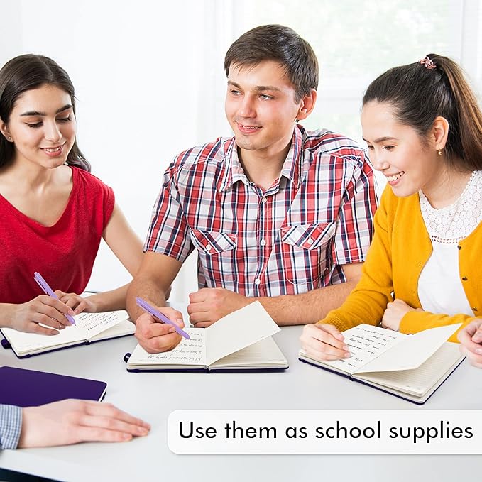 • Feela 24 Pack Classic Ruled Notebooks contains 24 purple ruled sturdy cover notebooks and 24 Black Retractable Pens. Each of the notebooks measures 8.3” x 5.1”, which is perfect to carry and easily held by young girls and boys. These black cute pens are customized to be placed in the pen holder, which is pretty convenient.