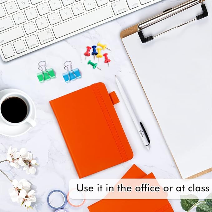 • Feela 15 Pack College Ruled Orange Notebooks contains 15 college ruled sturdy cover notebooks and 15 Black Retractable Pens. Each of the notebooks measures 3.5” x 5.5”, which is perfect to carry and easily held by young girls and boys. These black cute pens are customized to be placed in the pen holder, which is pretty convenient.