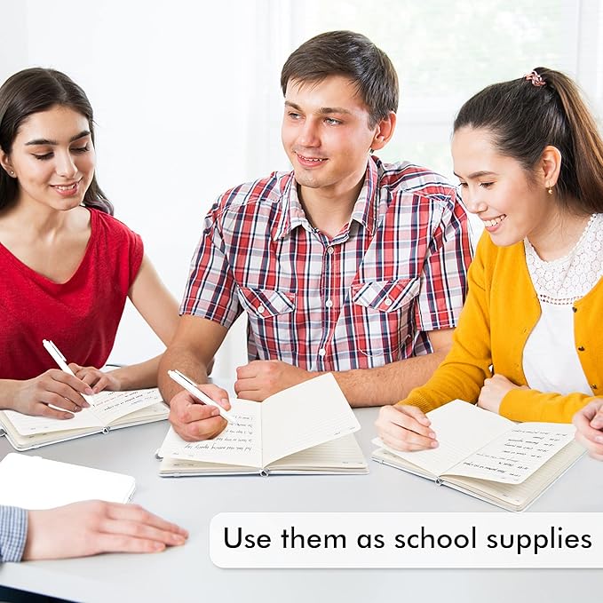 • Feela 24 Pack Classic Ruled Notebooks contains 24 white ruled sturdy cover notebooks and 24 Black Retractable Pens. Each of the notebooks measures 8.3” x 5.1”, which is perfect to carry and easily held by young girls and boys. These black cute pens are customized to be placed in the pen holder, which is pretty convenient.