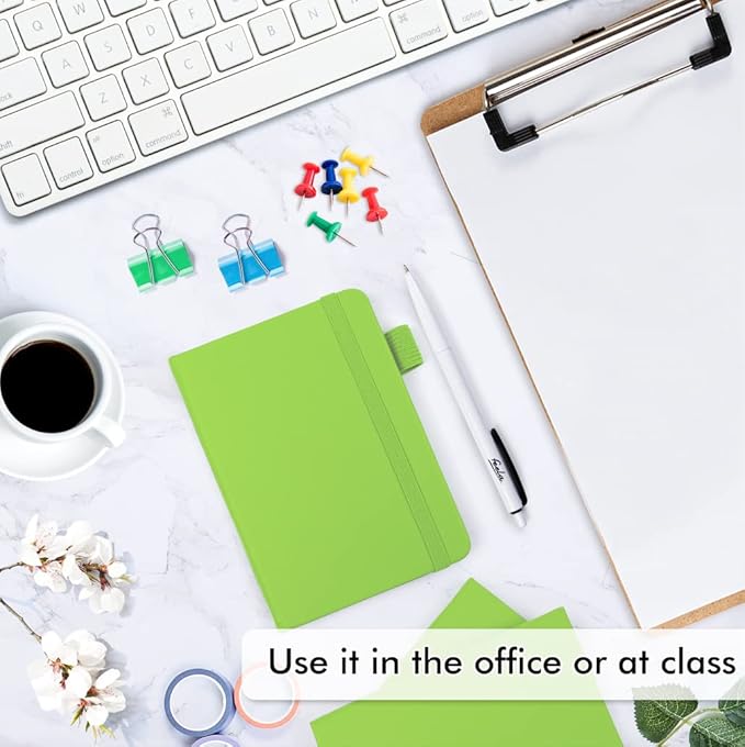 • Feela 15 Pack College Ruled Green Notebooks contains 15 college ruled sturdy cover notebooks and 15 Black Retractable Pens. Each of the notebooks measures 3.5” x 5.5”, which is perfect to carry and easily held by young girls and boys. These black cute pens are customized to be placed in the pen holder, which is pretty convenient.