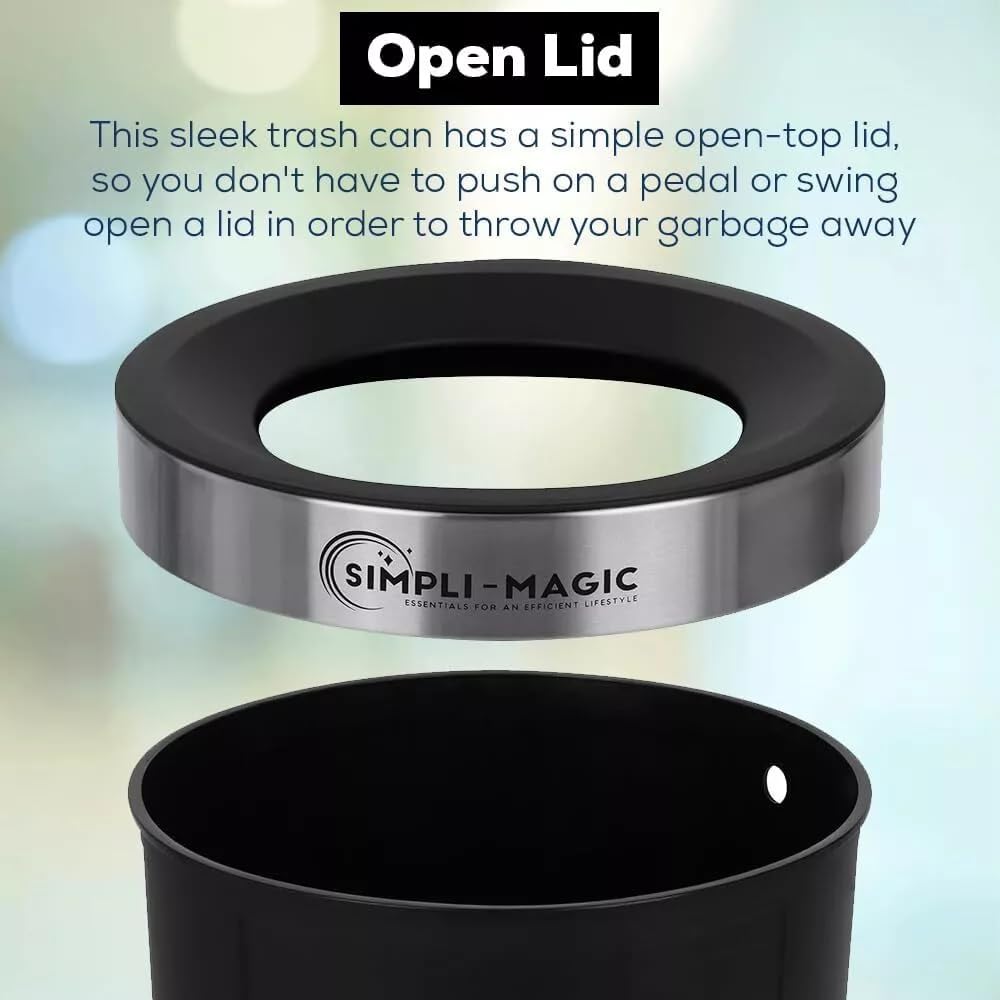 • No touch – The open top lid makes throwing away trash easier than ever. No more worrying about using a step pedal or a motion sensor.