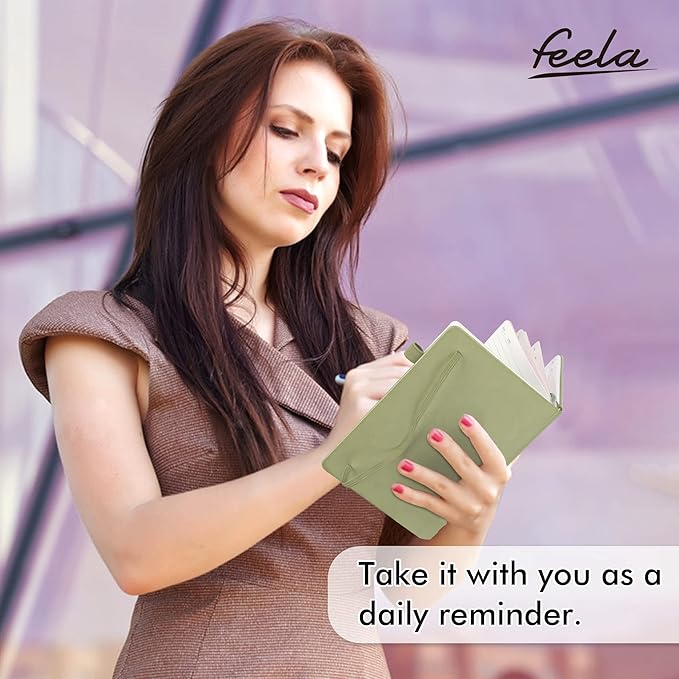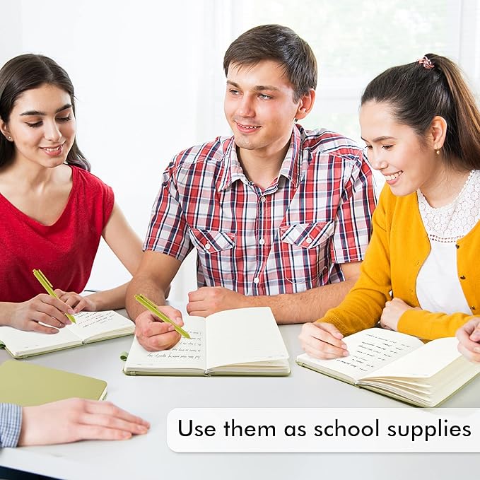 • Feela 5 Pack Classic Ruled Notebooks contains 5 Avocado Green ruled sturdy cover notebooks and 5 Black Retractable Pens. Each of the notebooks measures 8.3” x 5.1”, which is perfect to carry and easily held in hand. These black cute pens are customized to be placed in the pen holder, which is pretty convenient.