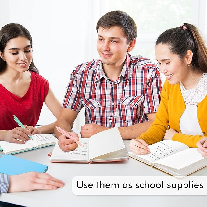 • 5 different mild colors for these notebooks. There are 5 Black Retractable Pens in the box. You can use it as soon as you receive it. These pens are perfect to be put in the pen holder of the classic ruled notebook. Large tube has the capacity of restoring more ink, which makes them long lasting. Quick drying can avoid smearing and smudge.