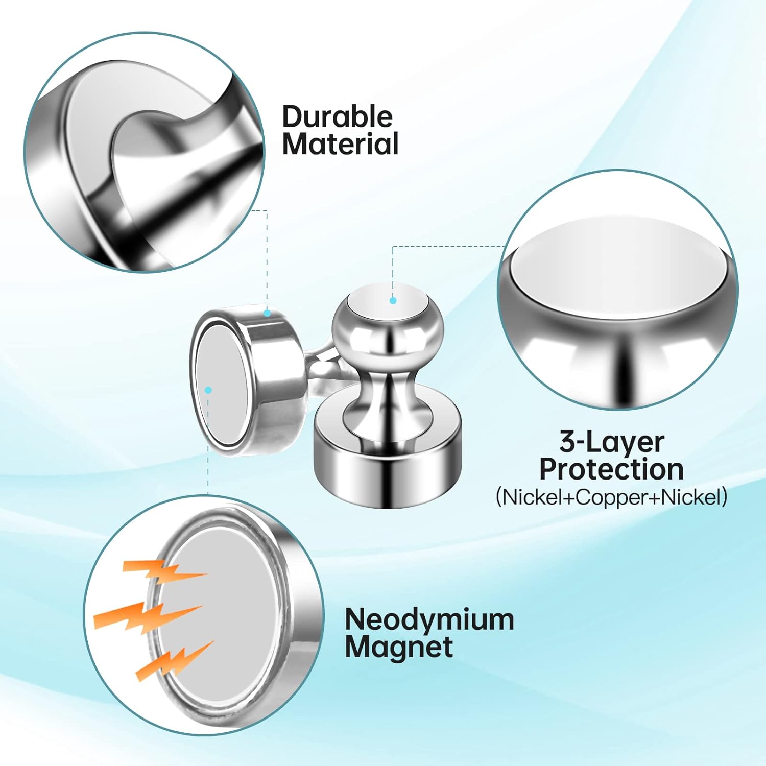 • 【STURDY & DURABLE】The office magnets strong are nice quality due to being metal, plated with 3 layers of 3-layer protection(black paint+nickel+copper), and the bottom is a neodymium magnet, which greatly protects office magnets decorative from corrosion. Very durable and worth the price.