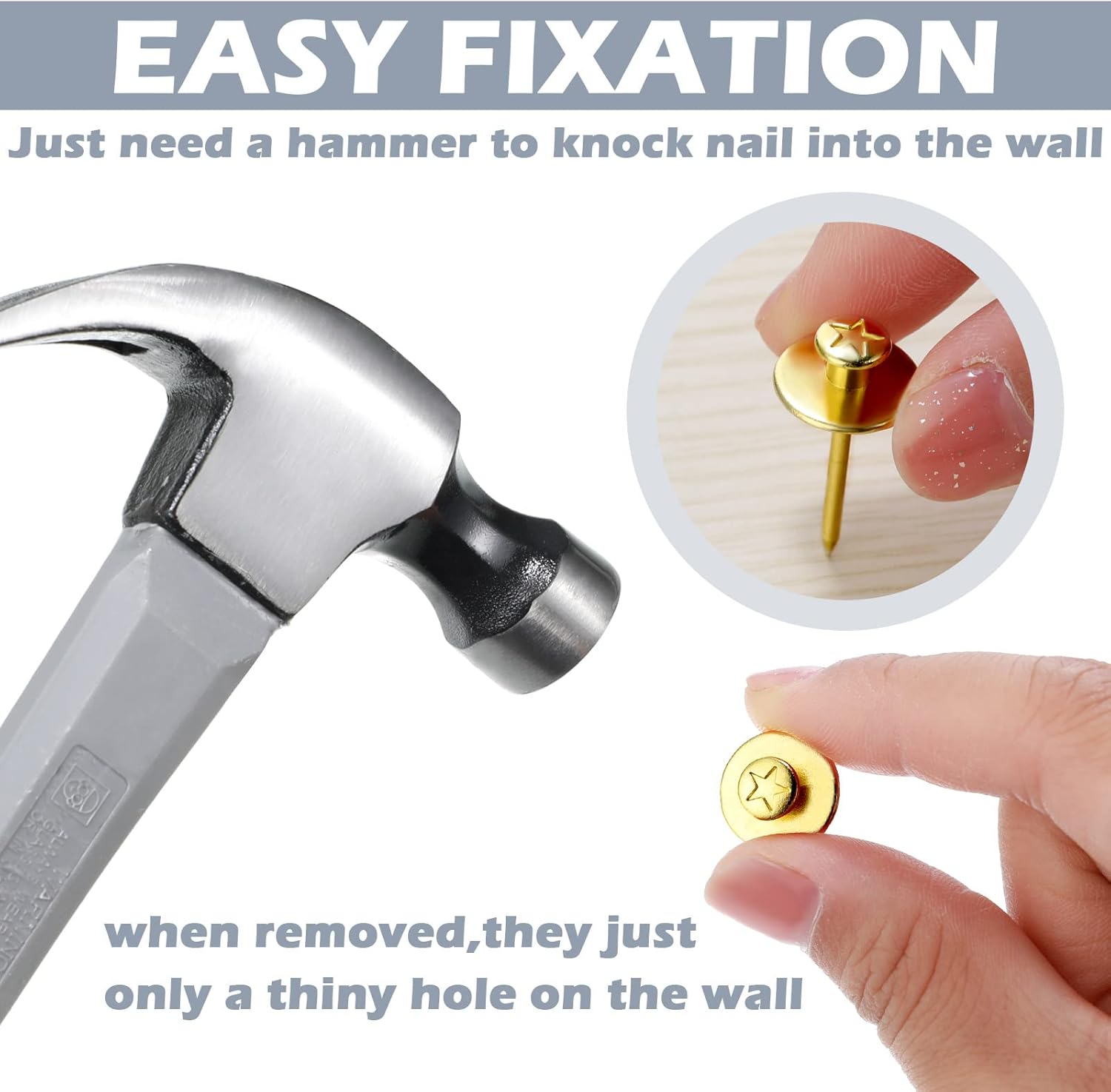 • Practical and Beautiful: picture hanger tacks are designed to be tacked into the wall, which will not affect the beauty of the home or damage the wall, just leaving a small hole in the wall; In addition, push pins for walls have proper crevice between 2 peg heads, which are suitable for you to hang a small pocket, key ring and more