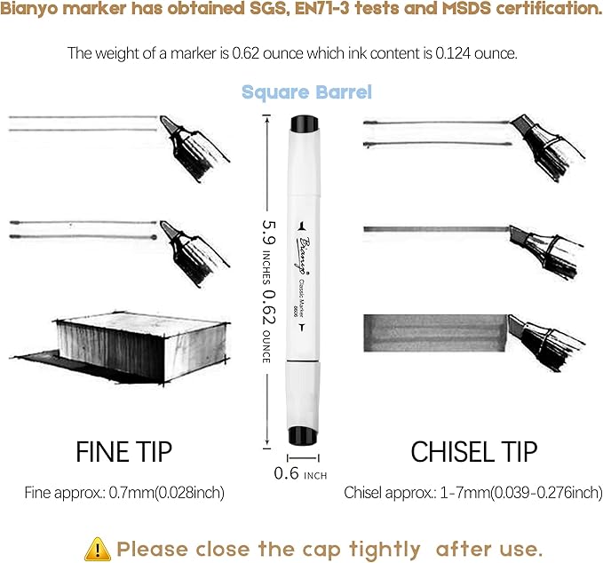 • Dual Tips: The chisel-tipped color markers are ideal for filling in blank areas with certain colors, allowing wide coverage with fewer strokes. Depending on how the pen has held the marker, you can draw different lines. The bullet-tipped sketch markers are ideal for details and outlining designs. The ergonomic design square barrel shape is super easy for holding and writing