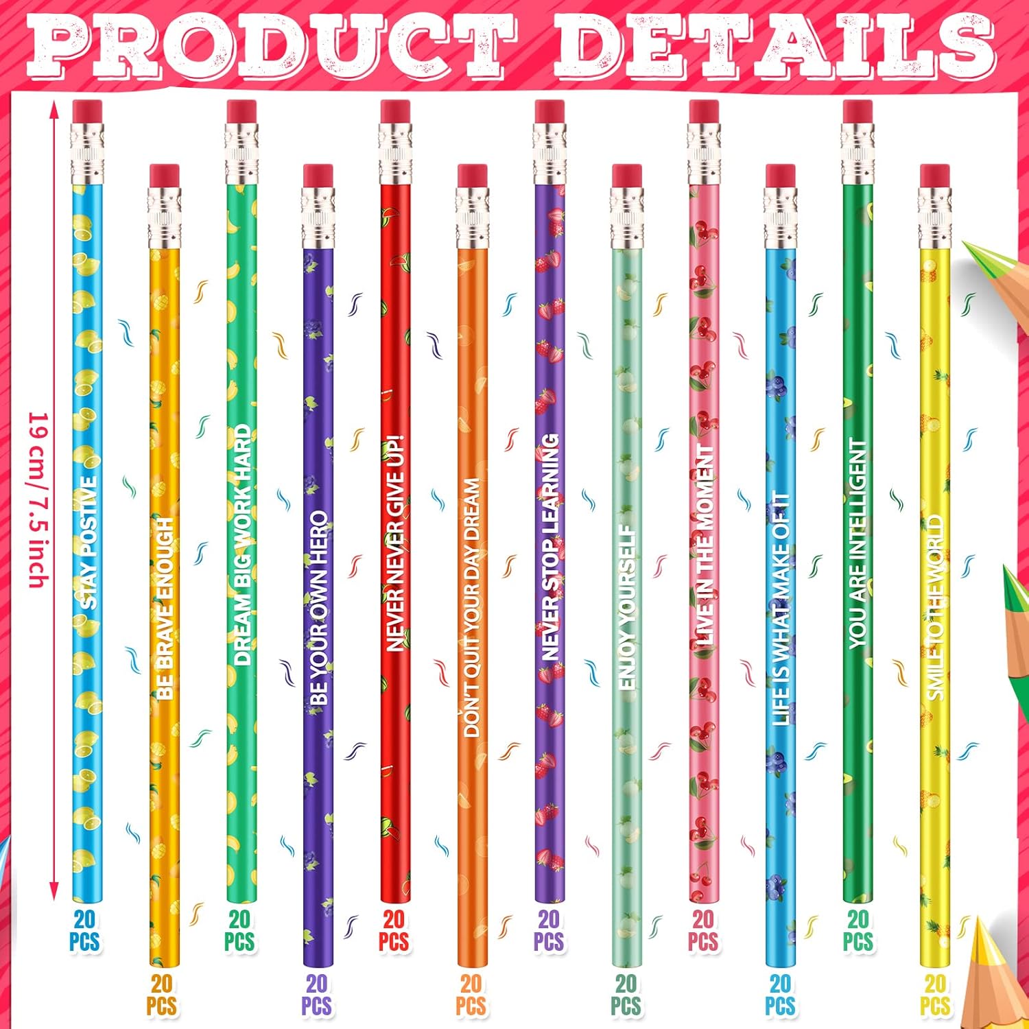 • What's Included in the Package: you will receive 240 pieces of scented pencils in 12 styles, 20 pieces in each style, measuring approx. 19 cm/ 7.5 inches in length, with red, yellow, purple and more, and each color is printed with fruit patterns and motivational sayings, sufficient quantity and diverse styles to meet your daily use and replacement needs