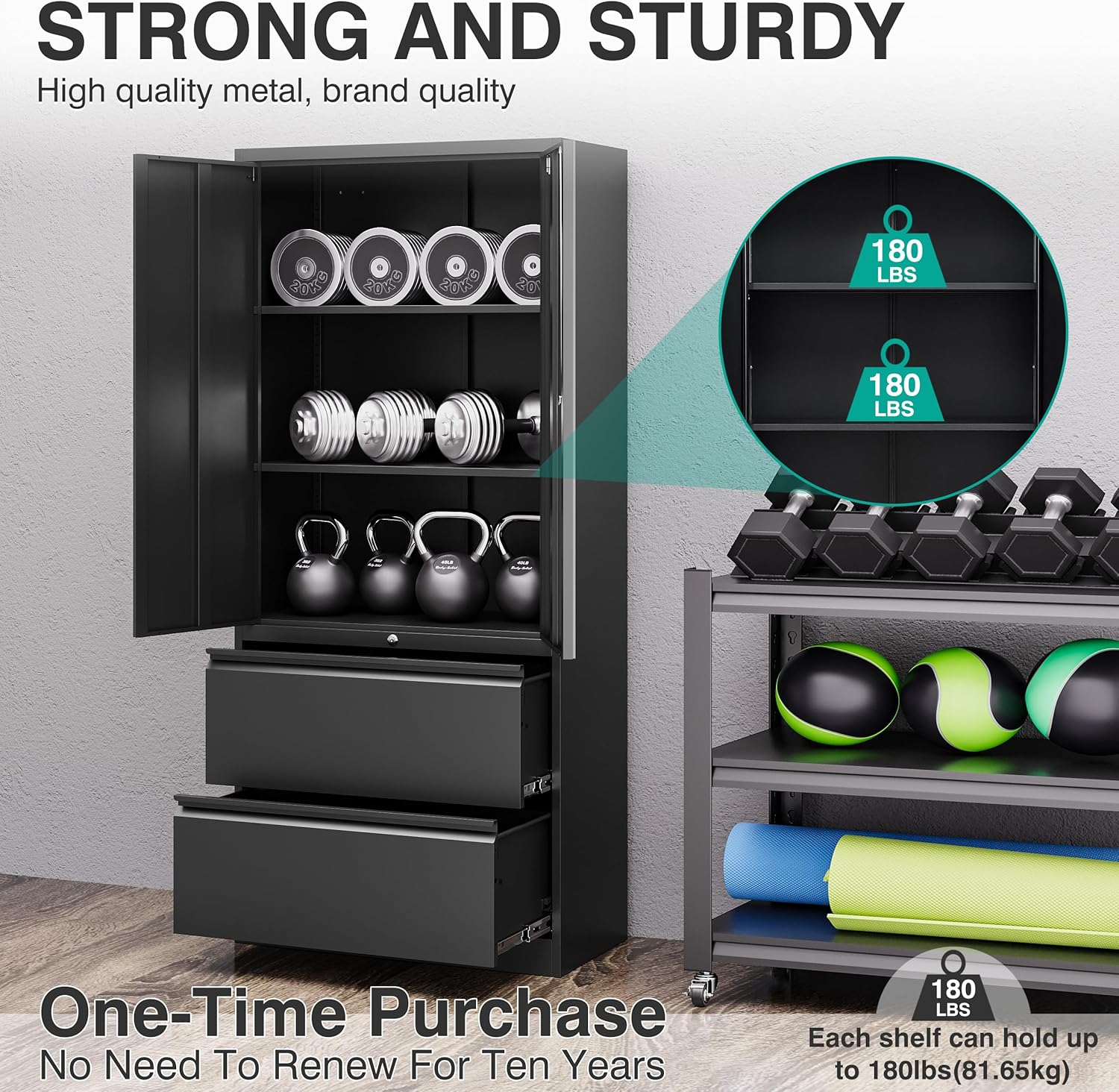• 【Tall & Wide & Deep-Large Capacity】: Large metal storage cabinet with 2 adjustable shelf to meet your different needs for placing items, shelf and door lock can highly protect items from temperature, dirt and dust