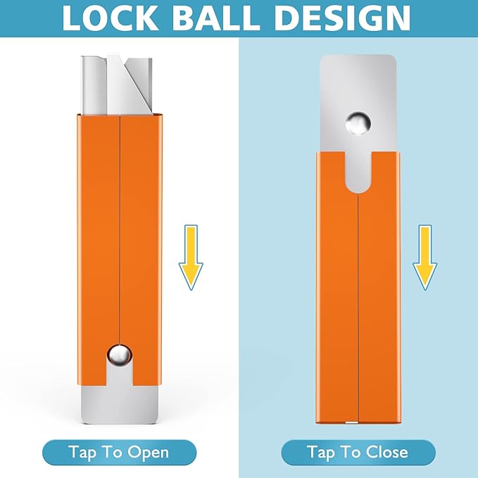 • Fast-paced Operation: Tap to open, tap to close, and the blade slides completely into the outer mental sheath. And it’s a razor blade utility knife that can be used as a razor scraper for scraping off stickers or paint residue on windows, tiles, boxes, concrete, and walls.