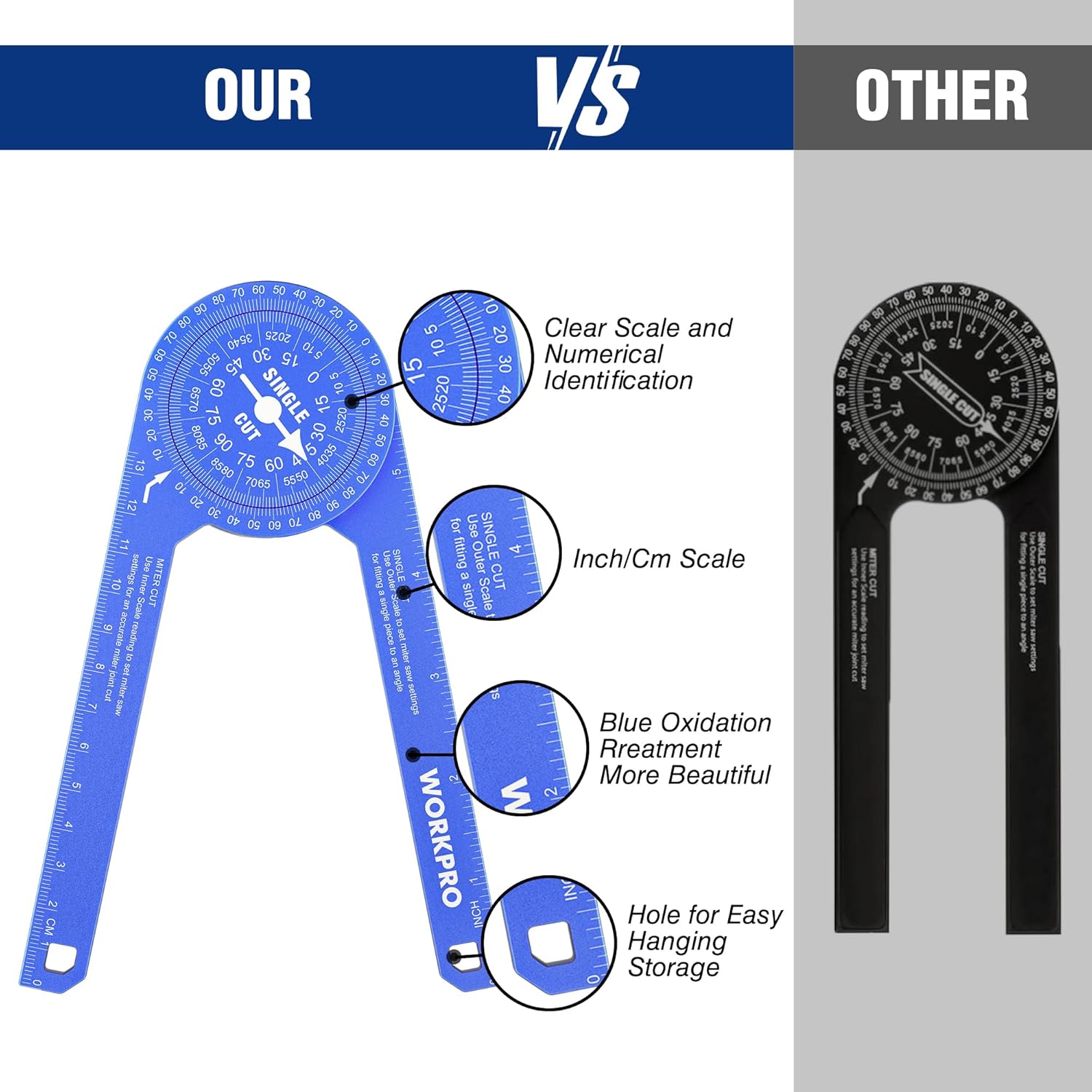WORKPRO Aluminum Miter Saw Protractor, 7.3 Inch Angle Finder Featuring Precision Laser Engraved Scales for Inside and Outside Corner, Carpenters, Plumbers and All Building Trades, 360° Rotation, Blue