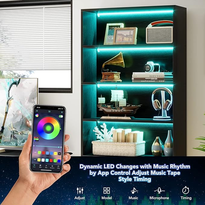 • [5-Tier Bookcases with LED Litinging]: Each tier of our tall bookshelf is equipped with an APP-controlled LED light strip, which can be adjusted to any color and brightness you like. Item weight: 65.4lbs. Heavy and strong.