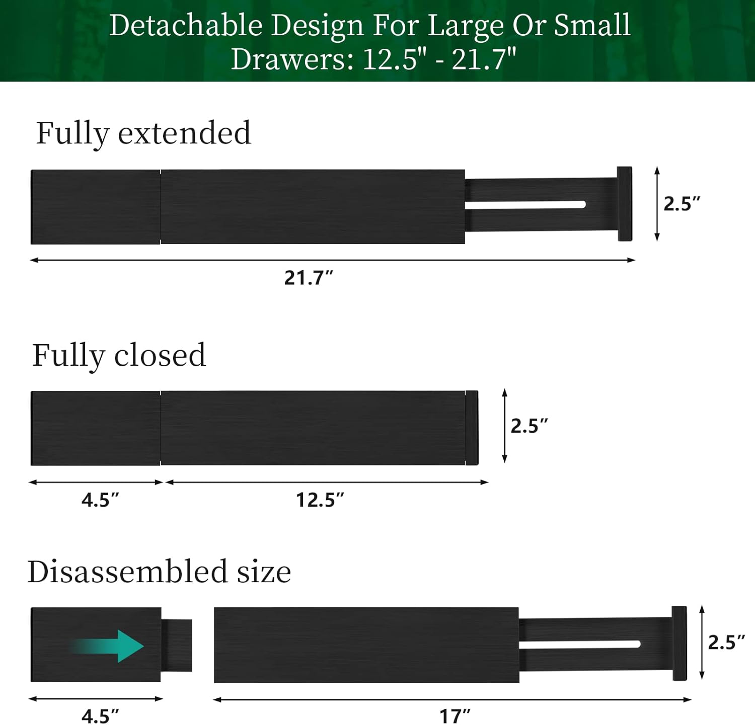 • Adjustable Drawer Dividers: Adjustable drawer dividers range from 11.8-17 inches in length; fits easily in most drawers to keep your belongings organized and easy to access