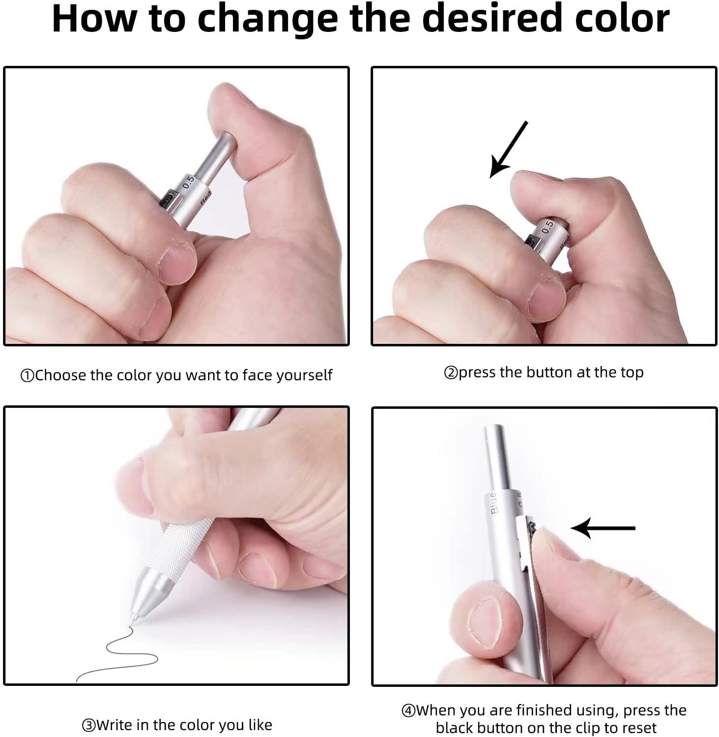 • Switch refills: first select the color you need, mark the words of the color facing yourself, tilt back 30 degrees to hold the pen press to get the desired color refill, then press the reset button on the clip to recycle the refill.