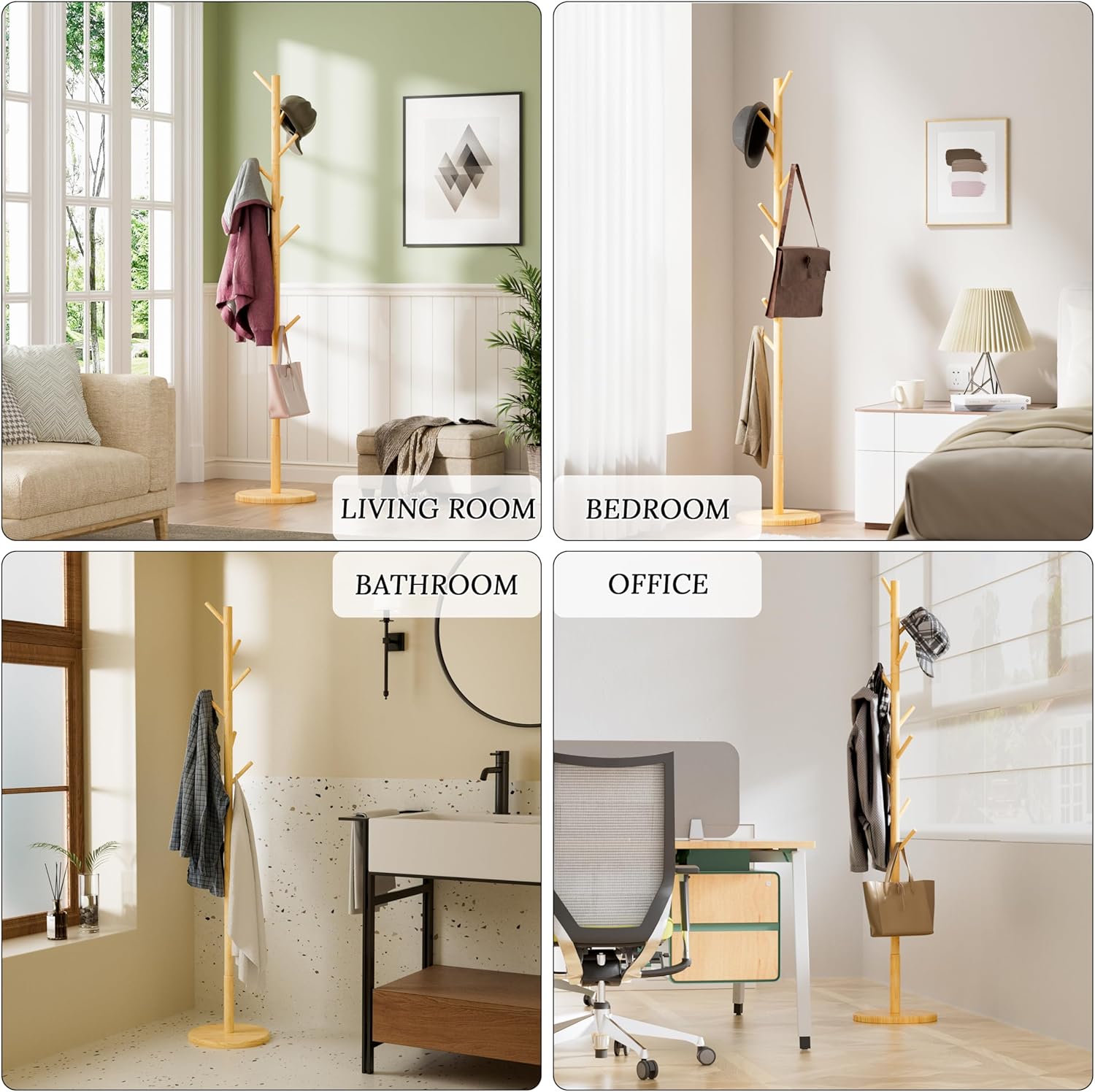 Wooden Coat Rack Freestanding with Round Base, Adjustable 4 Heights Sturdy Coat Hanger Stand 9 Hooks for Hanging Bags, Hats, Save Space Coat Tree for Narrow Place, Entryway, Bedroom, Office (Natural)