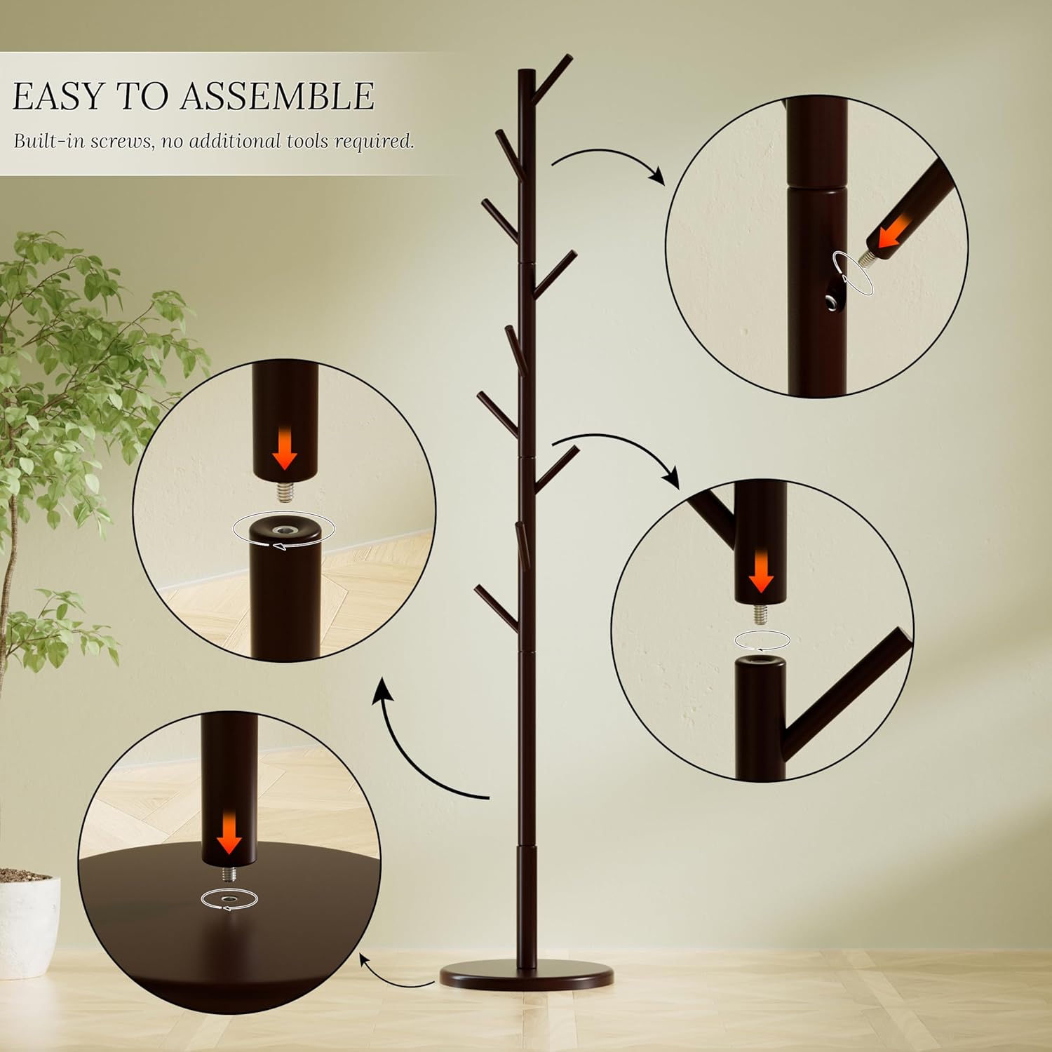 • 【EASY TO ASSEMBLE】 No tools are required, the coat stand is already equipped with metal screw holes, follow the instructions to rotate and tighten, and you will get a stable standing coat rack