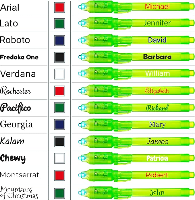• GREAT GIFT FOR FUN PARTY FAVORS: These Personalized Invisible Spy Pens come in a pack of 24 Green Pens to make the activity more exciting and fun.The color of the light is blue and it will display the words written in clear ink for all pens. Batteries are included and installed. Parents can buy these Spy Pens for their kid’s party at home. Schools, Teachers can buy it for students for a school Activity. Add it for any surprise gift bag or as Stock Stuffers.
