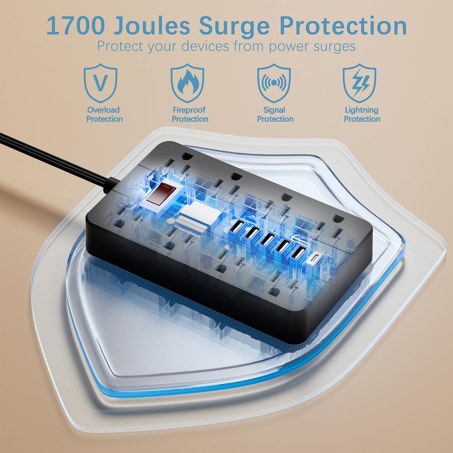 • Power strip with 6 USB: 6 USB ports detect your devices automaticlly and charge in the fastest speed; The USB port provide 5V/2.4A max while using one port, 5V/3.4A 17W total; No need a variety of converters, Compatible with phones, tablets, and other electronic appliances