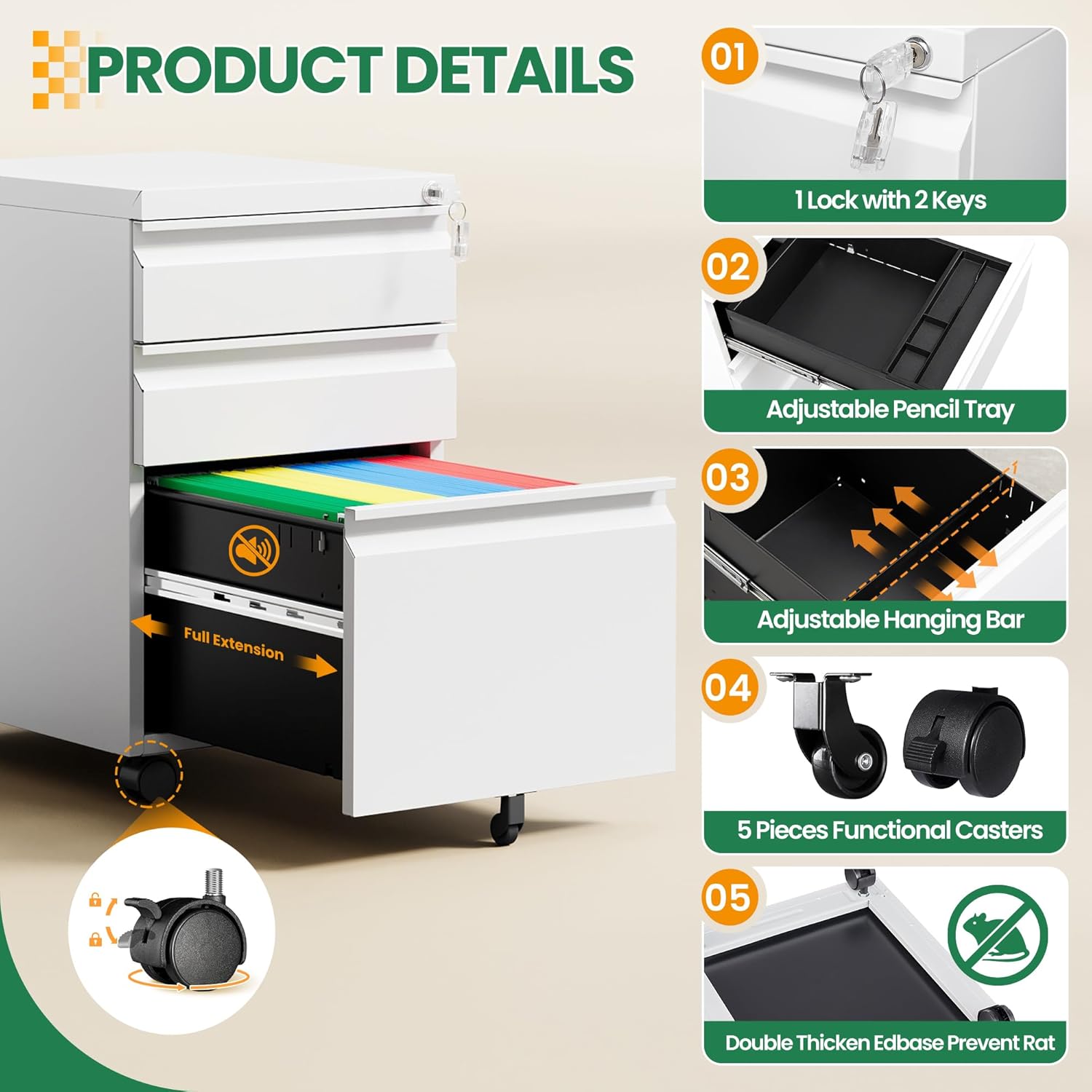 3 Drawer Mobile File Cabinet with Lock,Under Desk Filing Cabinet for Home Office, Metal Filing Cabinets on Wheels for Legal/Letter/A4 File, Fully Assembled Except Wheels, White