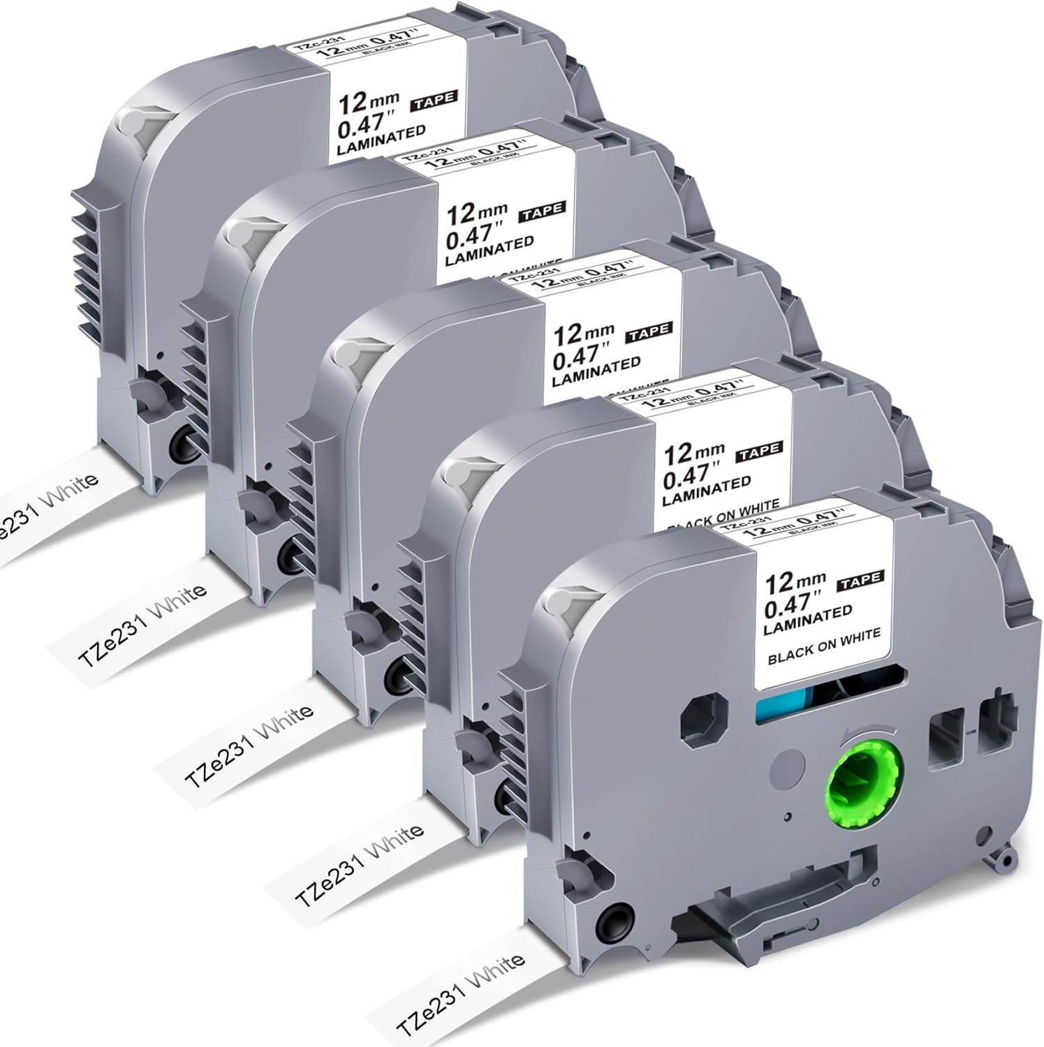 • Package Includes: 5 Pack P Touch Label Tape 12mm TZe-231 TZe 231 TZ-231 TZC-231 Tape; Dimensions: Width- 1/2 inch (12mm 0.47 inch), Length- 26.2 feet (8 meter), Color: Black on White Label Maker Tape; NON-OEM tape
