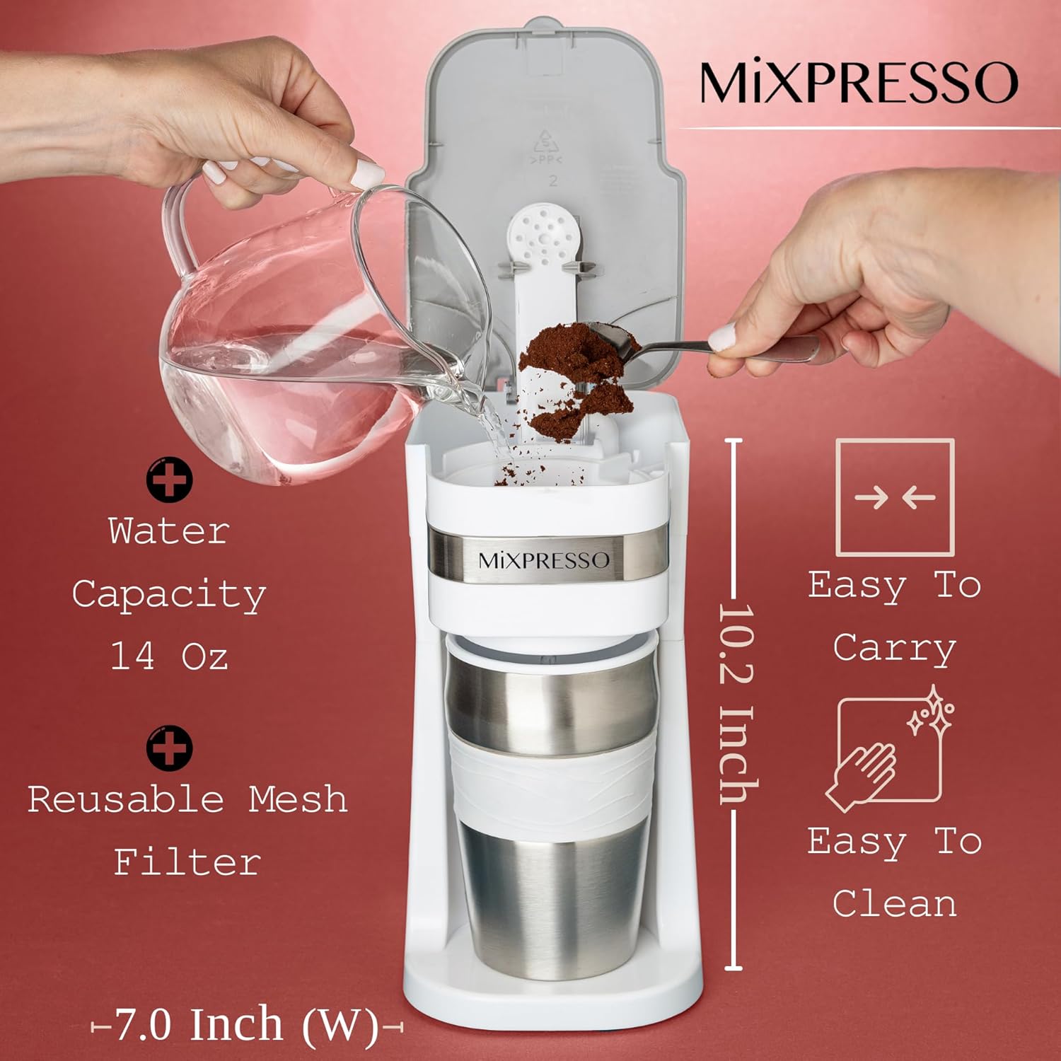 Mixpresso White Personal Single Serve Coffee Maker with 14oz Travel Mug, Drip Small Coffee Maker with Auto Shut Off, Reusable Filter, Works with Ground Coffee Only – Not for K-Cup Pods