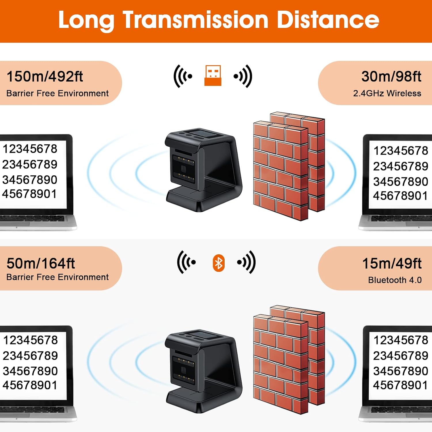 • 2.4G Wireless & Wired :Wired barcode scanner can directly place on the desk, no need to hold the scanner, release your hands, improving your efficiency. If you need to work on the move, 2.4G Wireless barcode scanner can follow you around and get the job done. Barrier-free environment 100Feet ,Barrier environments 50Feet .