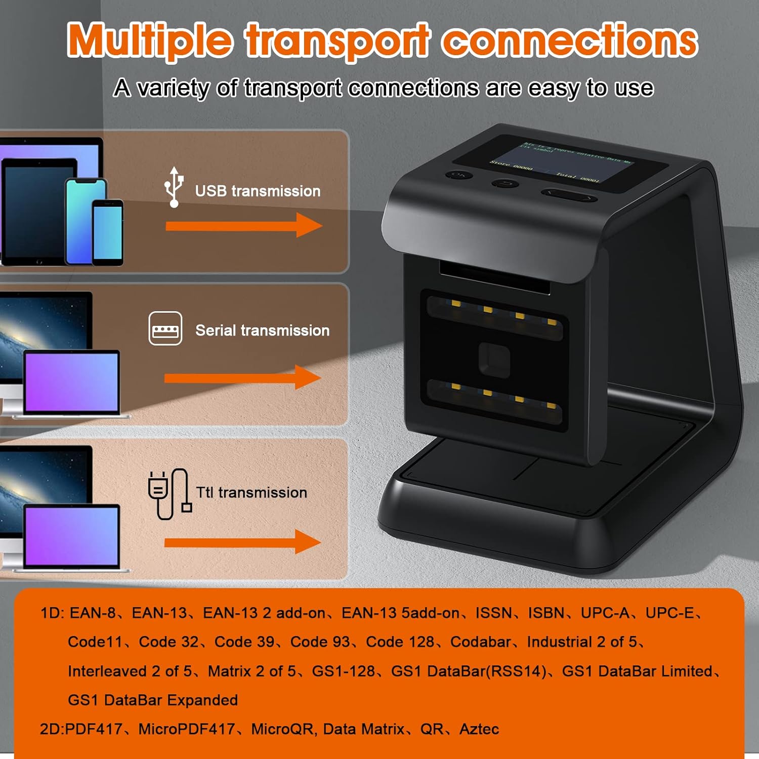 Alacrity 2D QR Wireless Barcode Scanner Hands-Free Omnidirectional Desktop Bar Code Scanner with Screen Display Compatible with Bluetooth & 2.4GHz Wireless for Airport Supermarket