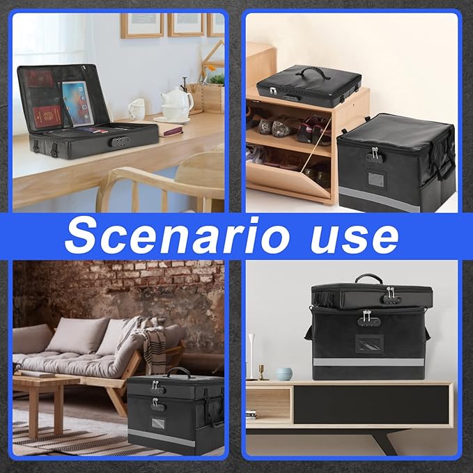 • PORTABLE FIREPROOF STORAGE BOX: Document organizer with lighter and sturdy handles, our fireproof box can be moved and carried more easily. You can use it in many places like home, office, car or outdoor activities. The inside of the filing box is supported by PP material, which is not easy to deform, so you can easily fold or stack multiple boxes together.