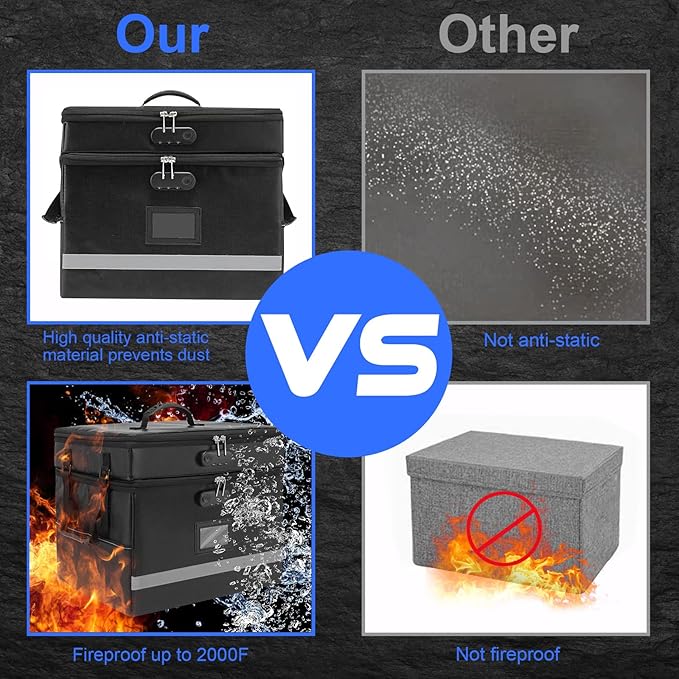 • HIGH QUALITY FIREPROOF FILING BOX: Made of double-layered non-itchy silicone coated fiberglass, EXLIFBAG file organizer is fireproof and waterproof to protect your document at most in bad condition like fire, flood and wet weather. The design of High-quality 2 way zipper provides great convenience when using. The non-slip pad on the bottom makes the document box more durable and stable.