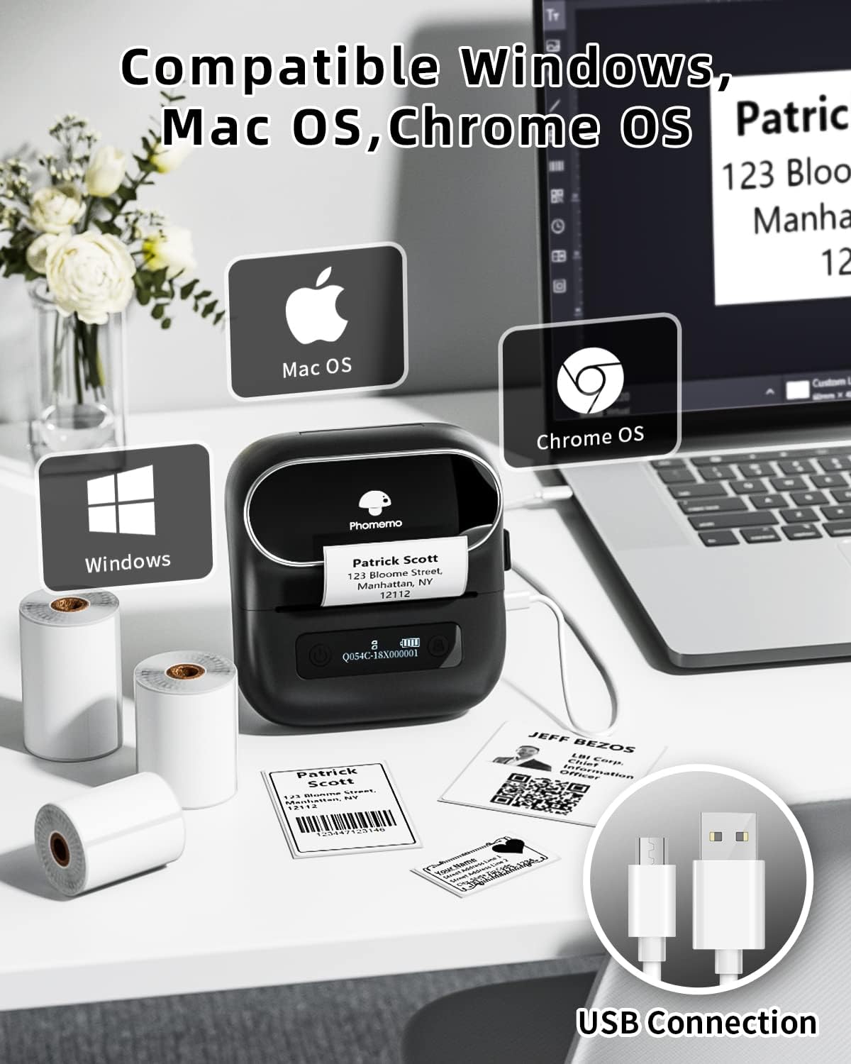 • Strong Compatibility - Phomemo Bluetooth label printer has high compatibility with IOS and Android mobile phones through Bluetooth, as well as USB connection support for Windows, MacOS, and ChromeOS. Watch our software installation tutorial for a hassle-free experience.