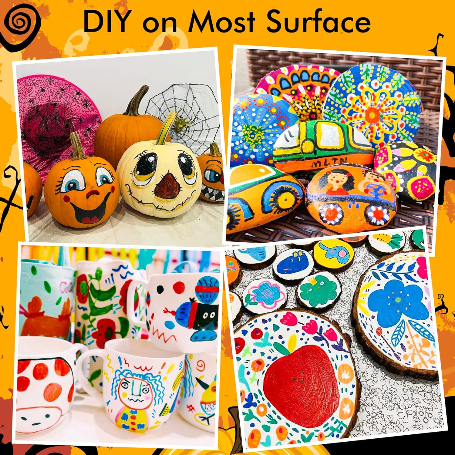 • 【MULTI-PURPOSE】: Enjoy creating art projects on a variety of surfaces, acrylic paint marker set suitable for rock painting, ceramic and mug painting, glass and wine glass painting, wood, fabric, stone, metal, plastic, canvas, Christmas ornament, Halloween pumpkin painting, scrapbook, bullet journal, custom mugs, DIY crafts projects, and much more for both smooth and porous surfaces.