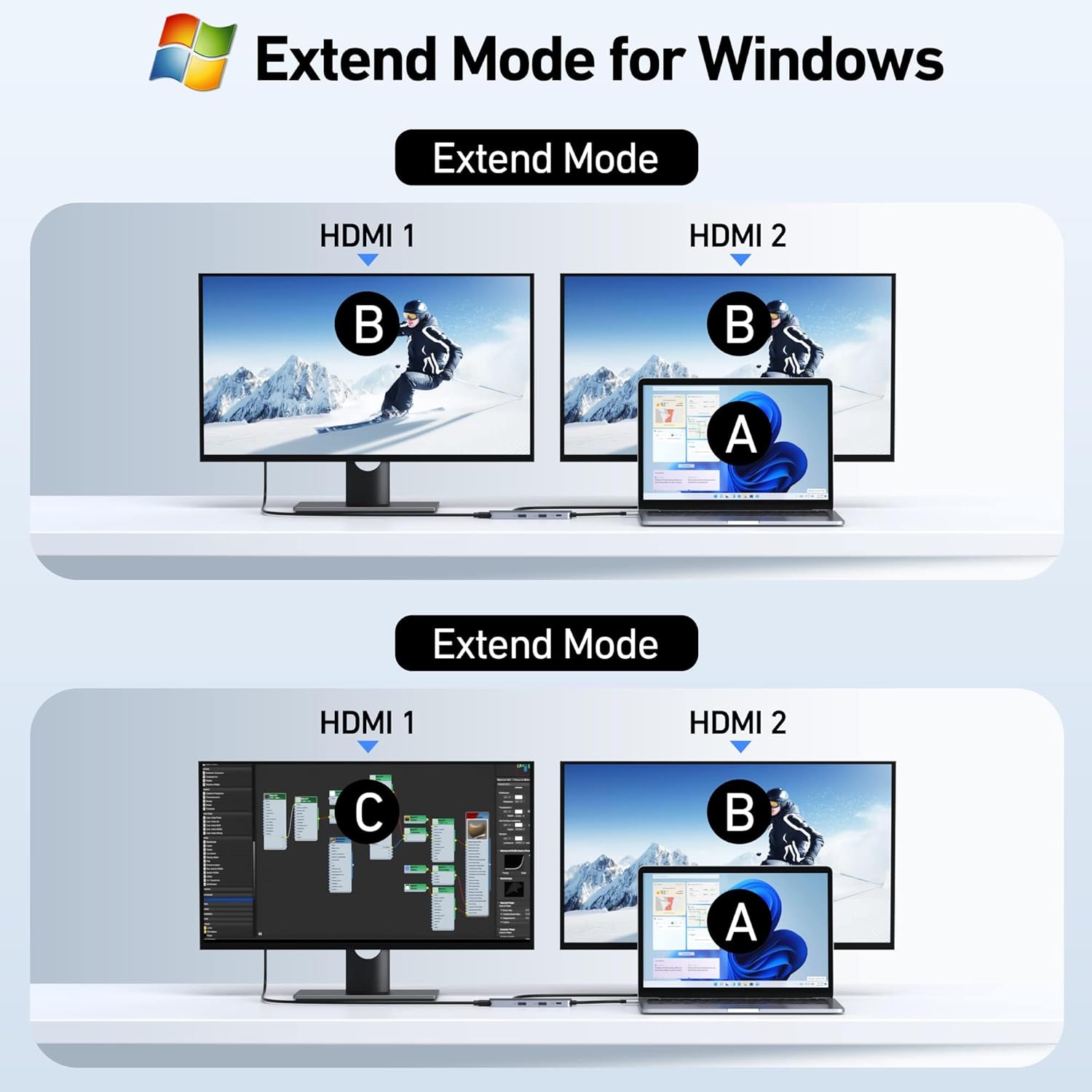 • [Dual Monitors Made Easy for DP1.4 Laptop] Note for Mac Users: This docking station only supports mirror mode (SST) on macOS systems, not extended desktop mode (MST). With our advanced intelligent technology, the 2 HDMI to USB C adapter provides temperature control and stable performance. Boost productivity with our usb c dual hdmi supporting MST mode under Windows Laptop for extending two monitors simultaneously