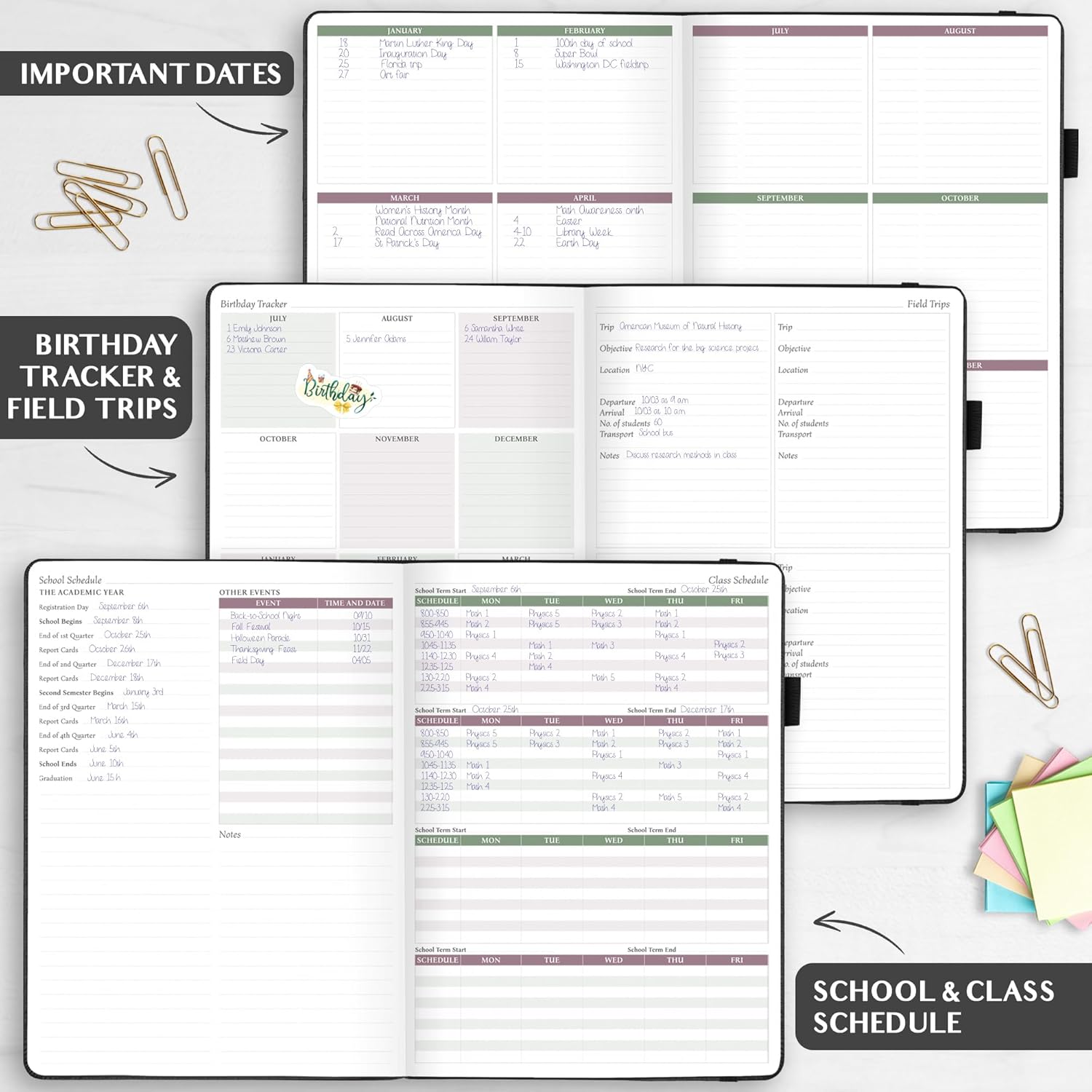 • STORE ALL HELPFUL INFORMATION IN ONE PLACE – At the front of the school year planner, you will find sections for important dates, birthdays, field trips, teaching goals, professional development events, passwords, student contacts and health information.