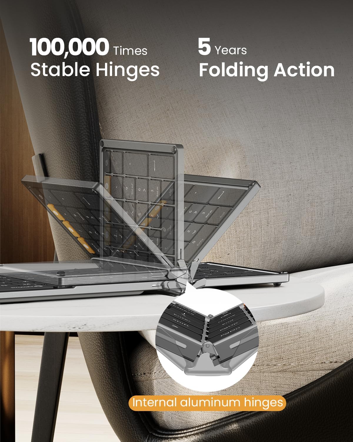 • Full-Size Productivity On The Go: A 105-key folding keyboard delivers a true desktop experience with dedicated function/number pads—ideal for spreadsheets, coding, or data entry anywhere. Designed for frequent travelers, its ultra-slim profile and flat typing surface (no tilt) enable effortless portability, while the simple fold-and-go mechanism (no locking clips) ensures quick deployment