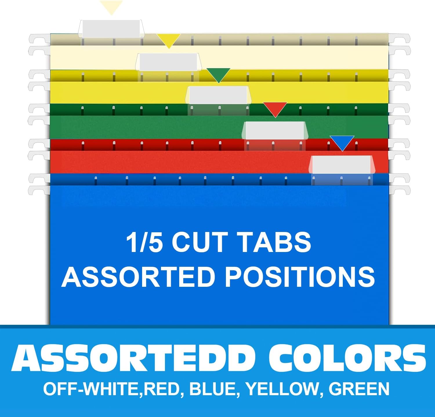 • HANGING FOLDERS SET: Contains 60 extra capacity folders with 60 cardboard supports, 60 printable label sheets, 60 clear plastic tabs and comes in 5 assorted primary colors (beige, red, blue, yellow, and green) to make color coded filing a snap.