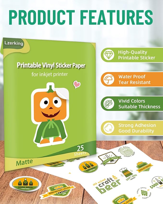 • 【PREMIUM PRINTABLE VINYL】This set includes 25 matte white sheets of printable vinyl sticker paper. Each self-adhesive vinyl sheet comes in the standard size 8.5 x 11 inches. High-quality vinyl sheets can be your good choice for printable sticker paper