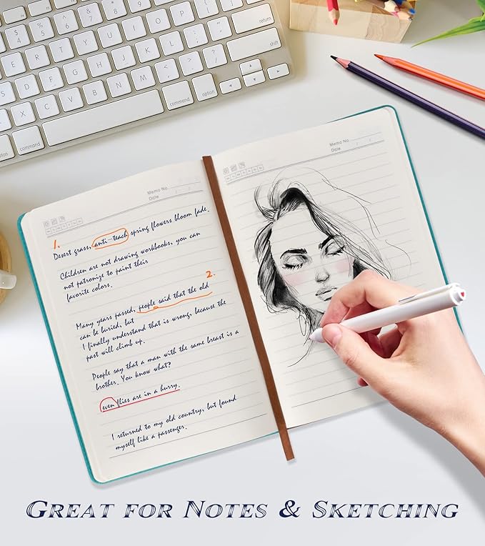 • 【256 Pages Premium Paper】We use 256 Pages (128 Sheets) 80Gsm acid-free paper thick lined paper,Line spacing 8.5mm,so you can confidently use most pens, pencils, and markers without ghosting and bleed-through.The Light yellow paper resists damage from light and air and the paper protects your eyes from irritation.